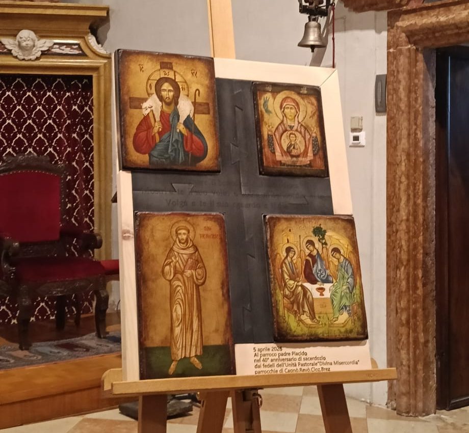 In effetti a Cagnò gli è stato consegnato il primo elemento: un’icona raffigurante il buon Pastore, quel Cristo cui egli ha scelto di consacrare la sua vita; a Cloz, poi, gli è stata donata l’icona della Trinità, quella comunità d’Amore che padre Placido testimonia da quarant’anni e a cui da sempre invita anche le nostre comunità a conformarsi; è stata poi la volta di Brez, che ha donato al parroco l’icona di Maria, la Vergine cui padre Placido sempre insegna a guardare come alla propria Madre; infine il dono si è completato a Revò con l’icona di San Francesco, nella cui spiritualità padre Placido ha vissuto la propria vita sacerdotale e viene da lui sempre presentato come modello anche alle comunità dell’Unità Pastorale.