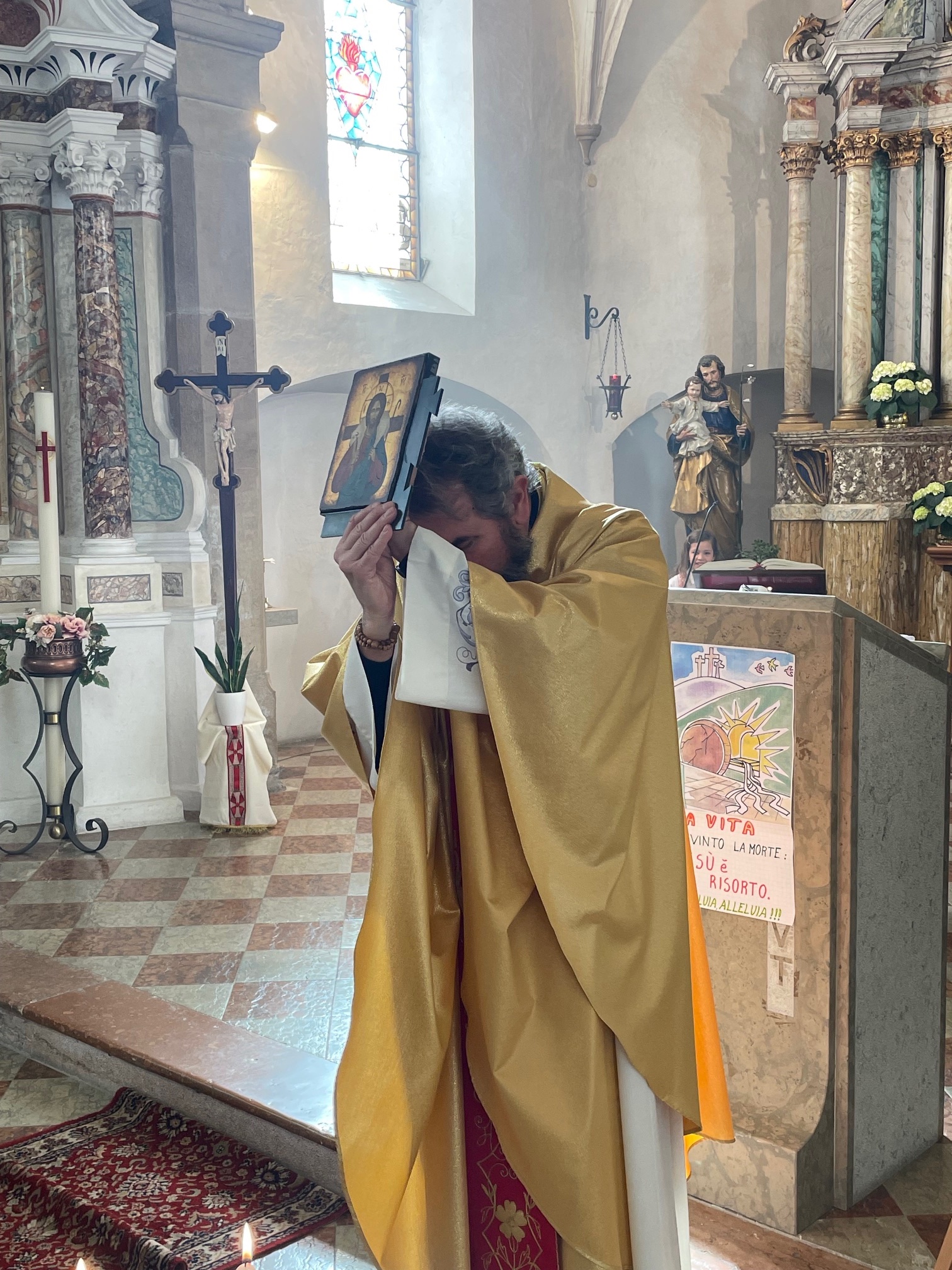 Sai già, padre Placido, che come Unità Pastorale abbiamo pensato per te a un dono che si sta componendo, quasi come un puzzle, di Messa in Messa: a Cagnò ti è stata donata l’icona del Buon Pastore, a Cloz quella della Trinità. Il nesso tra questi due elementi del puzzle è quanto ti doniamo ora: l’icona di Maria, Vergine e Madre di Dio.